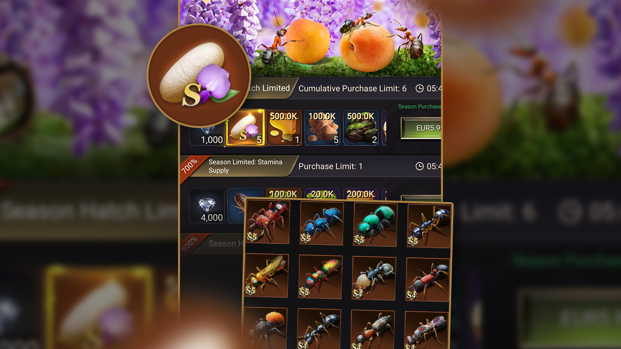Season Eggs are one of the most valuable resources in the island because they are currently the main way to obtain S5 special ants. Free players who are active can guarantee at least one S5 ant from the 100 luck point reward.